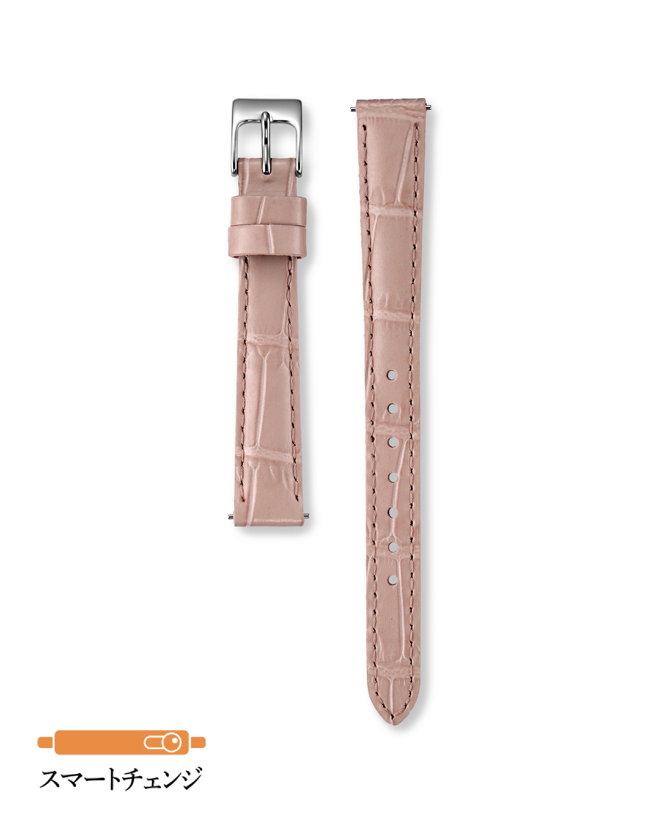 適度な厚みを持たせ、さまざまな時計に合わせやすいバンドです。ワニの本革を思わせる綺麗なタケフが特徴です。スマートチェンジ仕様のため、工具なしで付替えが可能です。付属部品や仕様については、改良等により予告なく変更する場合がございます。予めご了承ください。