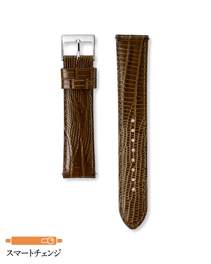 トカゲのうち、長方形の斑柄が特徴のテジューを型押しした牛皮革バンドです。風変わりな個性あふれる型押しです。付属部品や仕様については、改良等により予告なく変更する場合がございます。予めご了承ください。